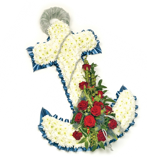 A white Chrysanthemum based anchor tribute with a spray of Roses and a blue ribbon trim.