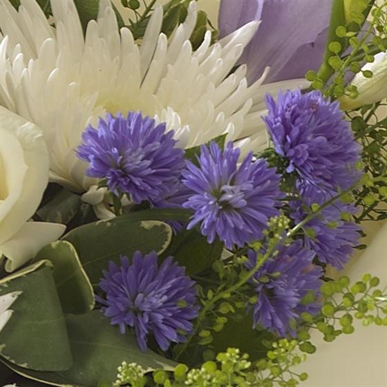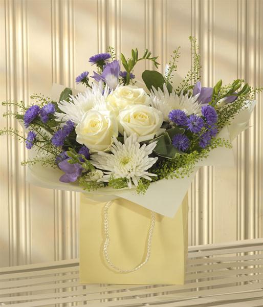 A perfect welcome for the birth of a baby boy. This beautiful hand-tied bouquet features Roses, Chrysanthemums and a selection of other purple and ivory flowers to compliment. Delivered in an aqua pack presentation bag.