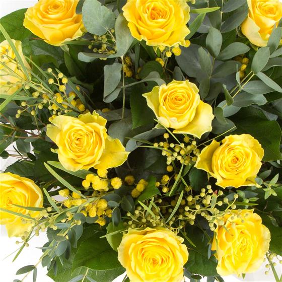 A dozen long stemmed golden yellow roses complemented with varigated foliage presented in water.