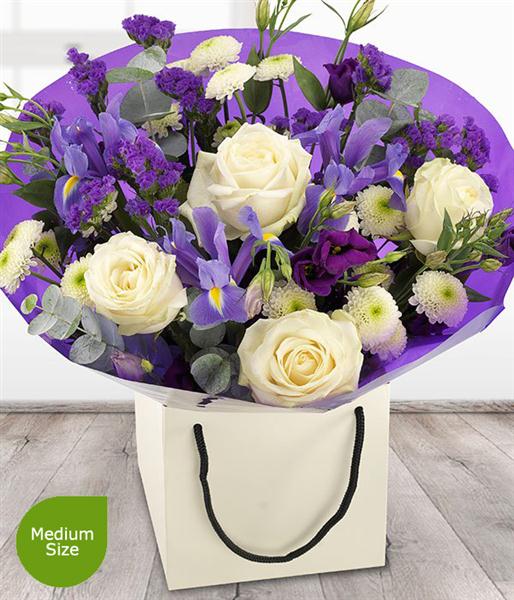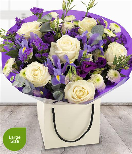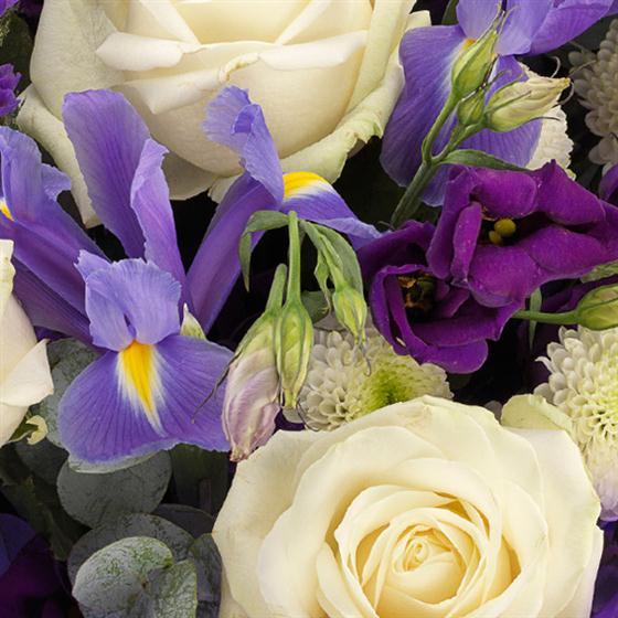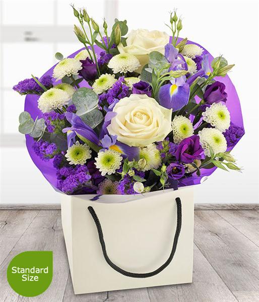 A pretty purple and white aqua pack bouquet featuring delicate white Roses and Spray Chrysanthemums with purple Lisianthus & Statice.