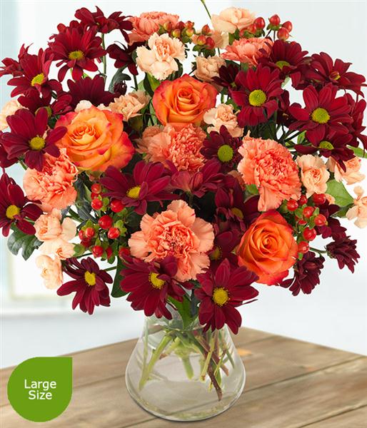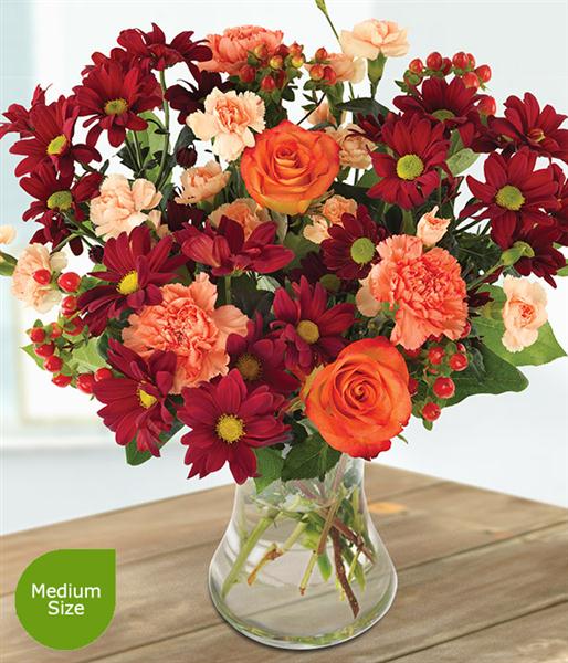 Bring home a hint of autumn with this glorious hand-tied flower bouquet. Orange Roses, Carnations and Hypericum berries are perfectly married with red Spray Chrysanthemums.