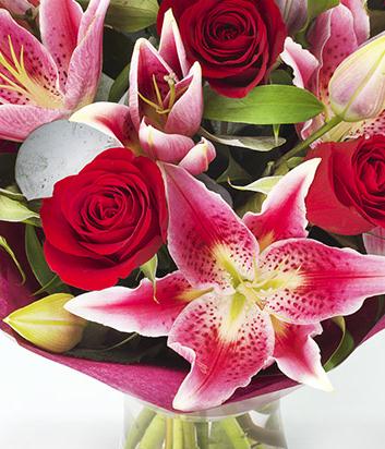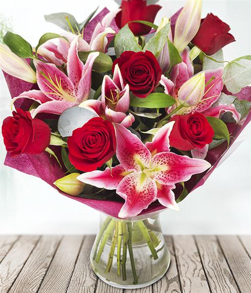 A stunning selection of premium red Roses offset with beautiful scented pink oriental Lilies. Gift wrapped to perfection in a hand tied aqua pack, presented in a bespoke 'Bettys' gift box.