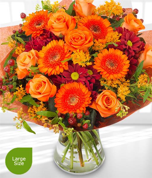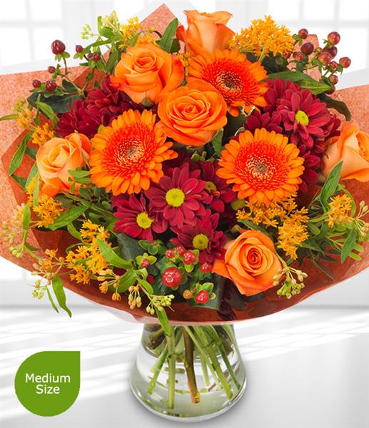 Send some cheer with this radiant bouquet of orange roses, orange germini, red chyrsanthemum and hypericum berries.
