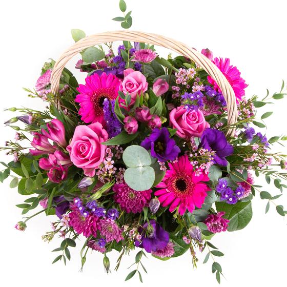 A colourful basket arrangement of cerise pinks and purples, including roses, mini gerberas, alstromeria and dainty wax flower.